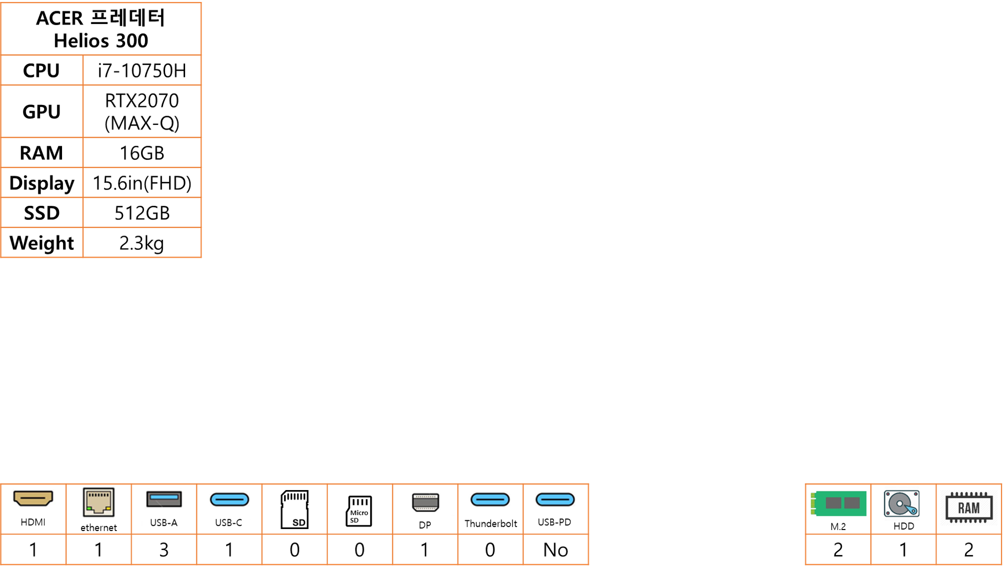 39.62cm(15.6인치) / 인텔 / 코어i7-10세대 / 코멧레이크 / i7-10750H / 2.6GHz(5.0GHz) / 헥사코어 / 1920x1080(FHD) / NTSC: 72% / sRGB: 100% / 300nit / 240Hz / 광시야각(IPS) / 슈퍼브라이트 / DDR4 / 16GB / M.2(NVMe) / 512GB / RTX2070 (MAX-Q) / VRAM:8GB / 기가비트 유선랜 / 802.11ax(Wi-Fi 6) / 블루투스 5.0 / HDMI 2.0 / mini DP / 웹캠(HD) / USB 3.1 Type-C / USB 3.0 / RGB 라이트 / ㅗ형 방향키 / 숫자 키패드(4열) / 배터리: 59Wh / 운영체제: 미포함(프리도스) / 두께: 22.9mm / 무게: 2.3kg / 용도: 게임용, 그래픽작업용 / 일반유통상품 / 색상 : 블랙