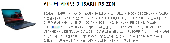 레노버 게이밍 3 15ARH R5 ZEN (SSD 256GB) : 구매링크