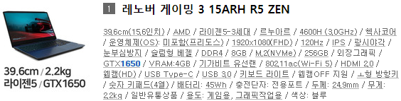 레노버 게이밍 3 15ARH R5 ZEN : 구매링크